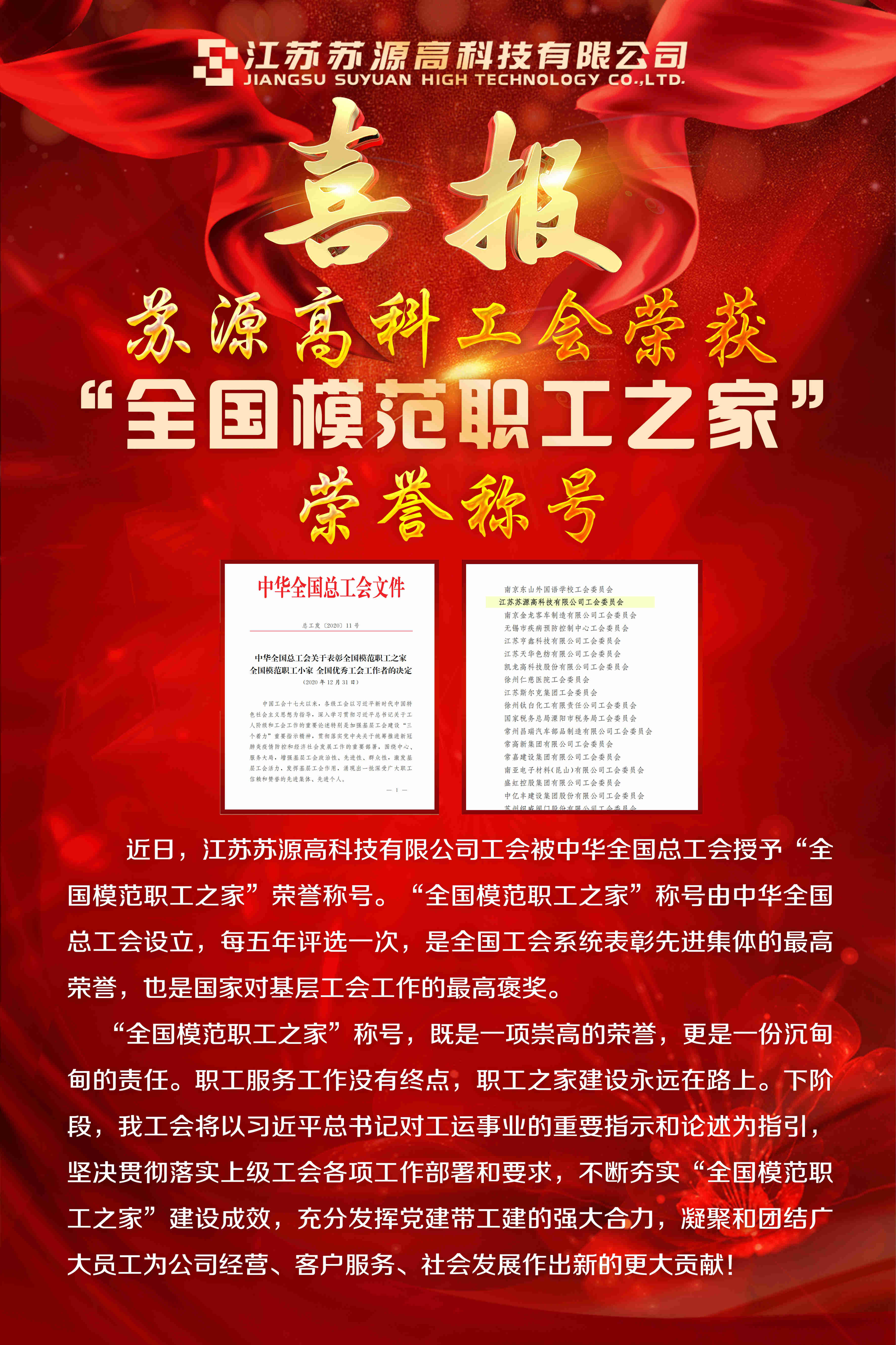 喜報!蘇源高科工會榮獲“全國模范職工之家”榮譽稱號